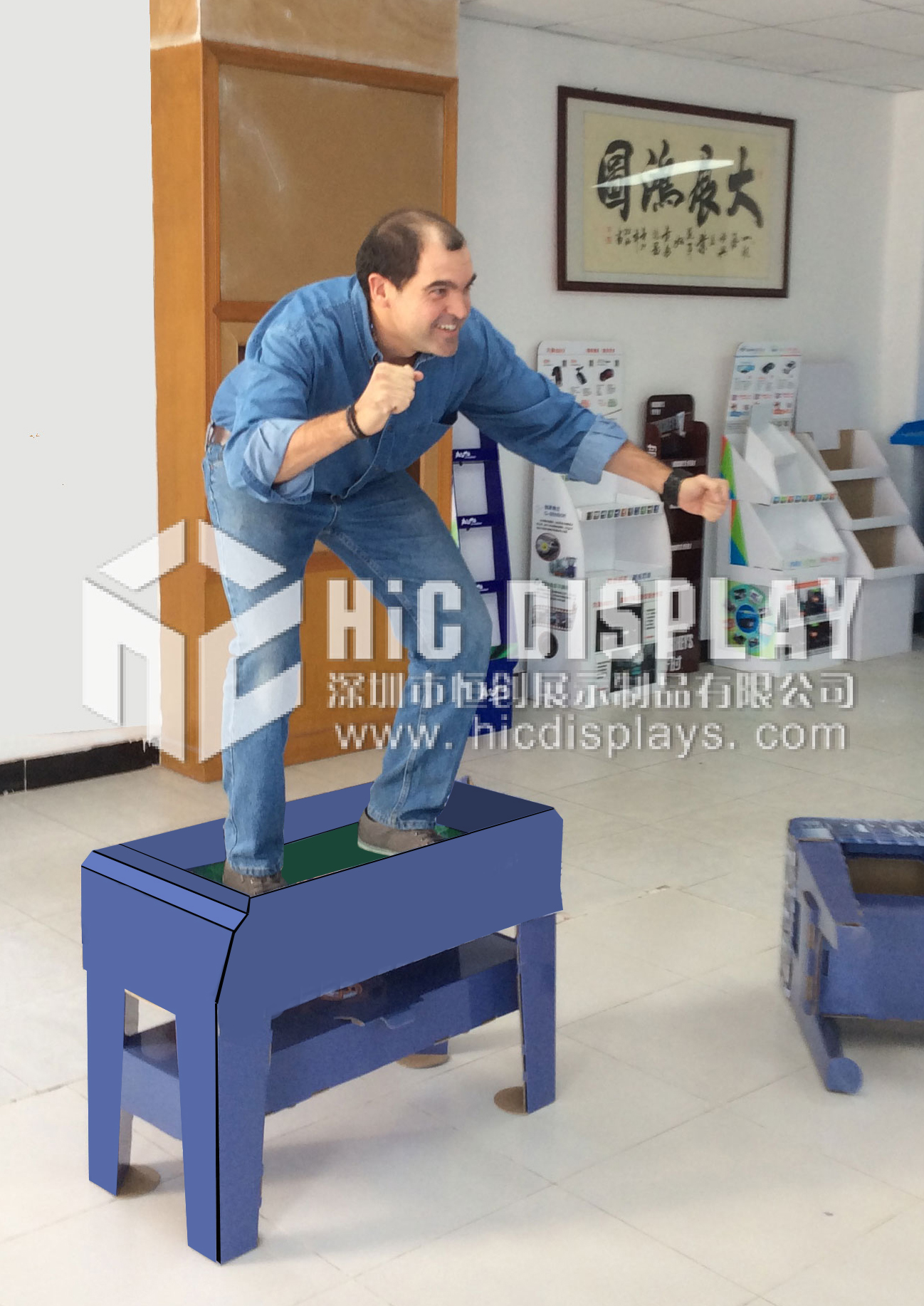 上圖是我們設計的桌子。這位體重95kg的外國客戶站上去也是沒有一點問題的哦。