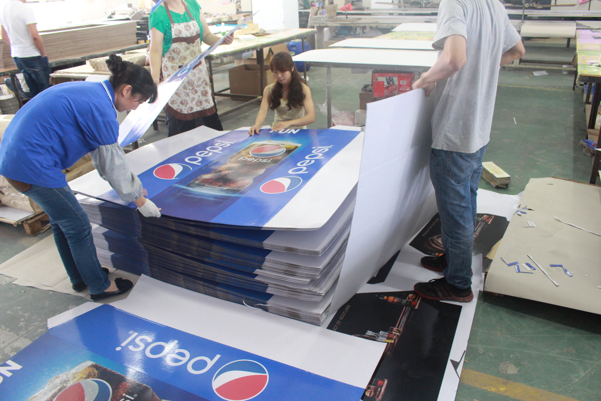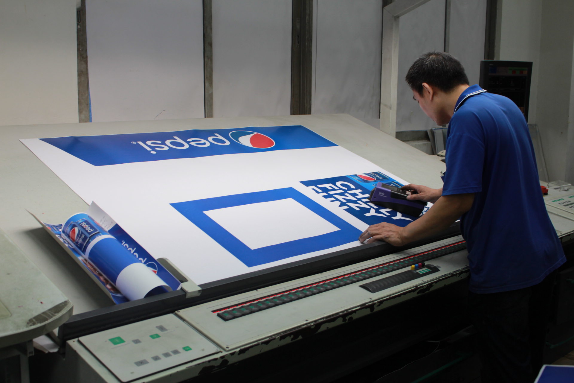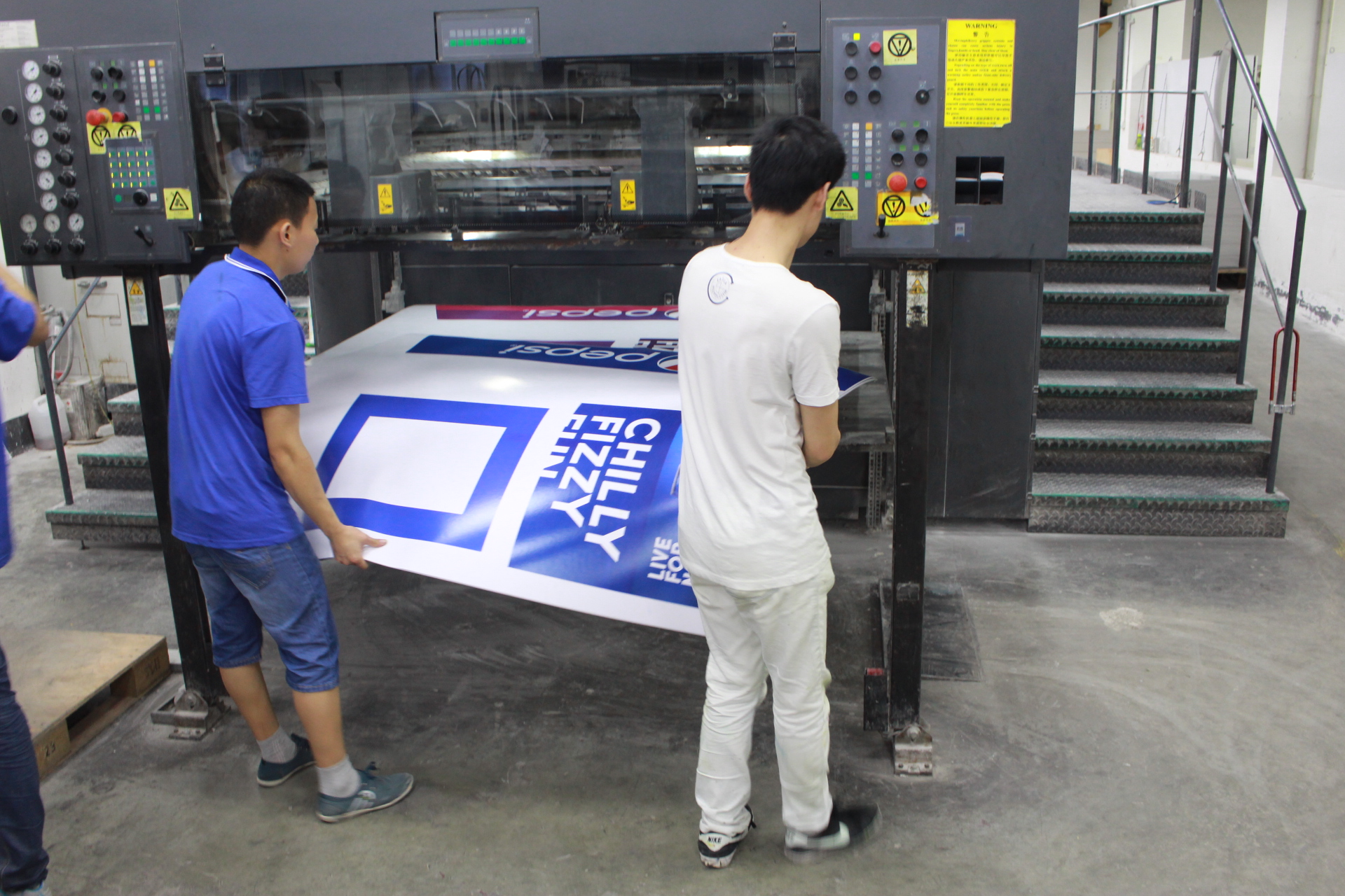 調(diào)色完成后才是開始印刷(Printing)。百事可樂的展示架我們用的是羅蘭超全開印刷機,最大尺寸可達1200*1600。印刷的時候三手們在印刷機后面上紙,機長與二手就會站在印刷機前看印刷的顏色是否會出現(xiàn)誤差。(下圖便是印刷過程的場景。)