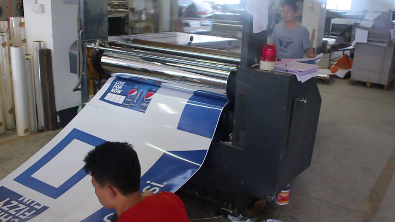 印刷過后便是讓面紙 過膠(Lamianting)了,百事可樂展示架我們采用的是光膜。光膜,顧名思義就是讓展示架看起來比較光滑,讓顏色看起來更加的亮麗。過了光膜之后的面紙還可以短時間的防水,所以不用擔(dān)心不小心把水灑在了上面,短時間內(nèi)擦掉是沒有影響的。