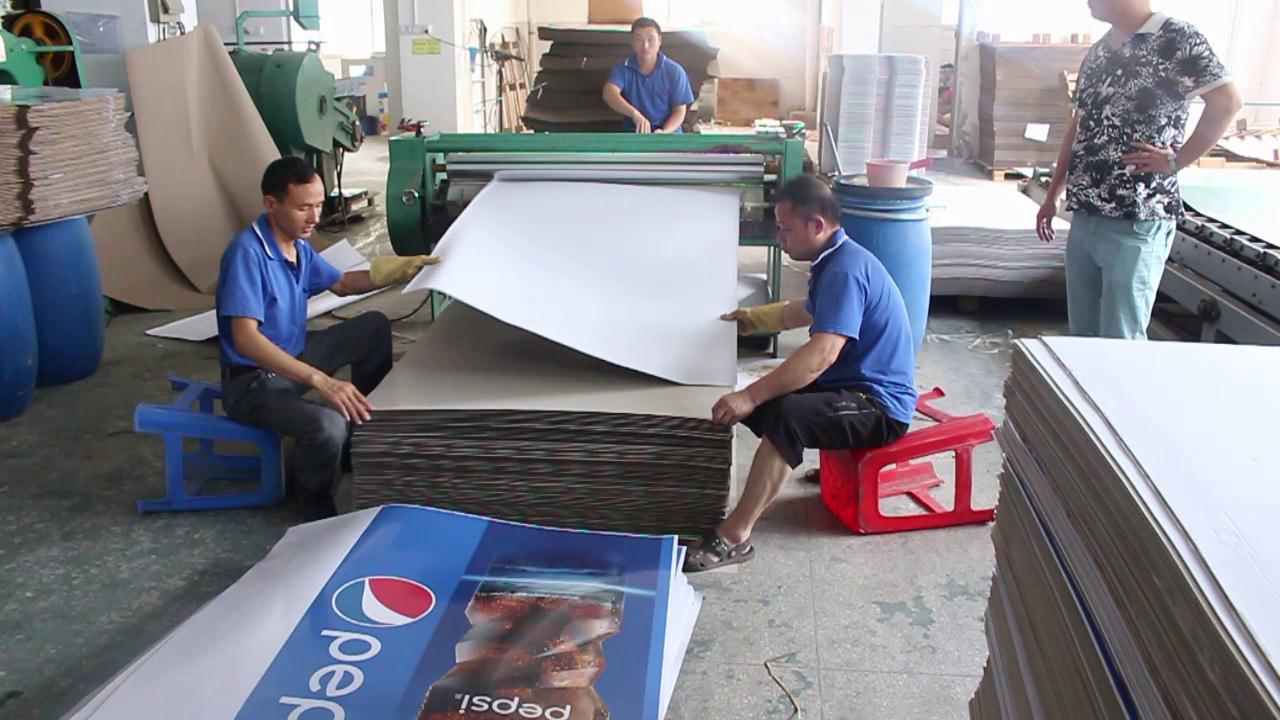 由于百事可樂展示架的面紙超出我們自動裱坑機的范圍,所以只能采用手動裱坑了。