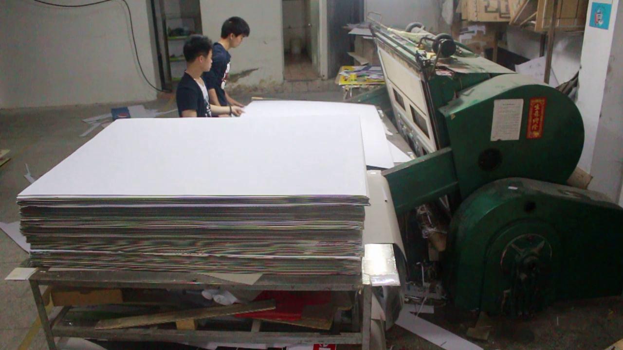 以上四步我們已經(jīng)把材料都準(zhǔn)備完畢了,接下來就是啤(Die cutting)。我們會將裱好的紙放進啤機里面,一合一開,我們要的展示架形狀就出來了。或許有人會問,為什么那么神奇,啤機只要一合上等到再打開的時候里面的紙就會出來形狀。那是因為我們在啤之前已經(jīng)準(zhǔn)備好了刀模放置在啤機里面,然后再進行調(diào)機。位置調(diào)好后就可以開始啤了。