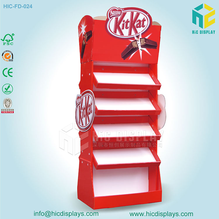 上圖就是雀巢旗下的Kitkat巧克力。這個展架的結構也屬于層式落地展示架,但是根據客戶的要求,我們把展示架的托盤設計成向下傾斜的托盤,而且整個展架的風格也是讓人耳目一新。從產品logo中發現紅色的元素于是我們在展示架上采用了大紅這種顏色。成功的點亮了屬于Kitkat巧克力的獨特魅力,無論放在哪個賣場上都是格外的吸睛。