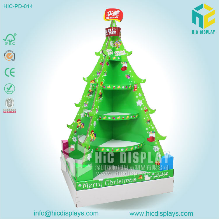 這款華美的堆頭在外觀上非常的新穎,采用了圣誕樹的造型。結構也是相對于傳統的堆頭要復雜一些,承重效果也是不錯的。也是采用了交叉受力的原理來設計的堆頭。這款產品的結構與外形也是介于落地式展示架與堆頭之間。
