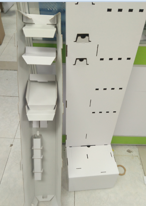 根據樣品的展示效果,我們發現1.展架不穩固,2.產品太擠了,3.放產品區域還需要有細節的更改。所以做了以下調整,如下圖: