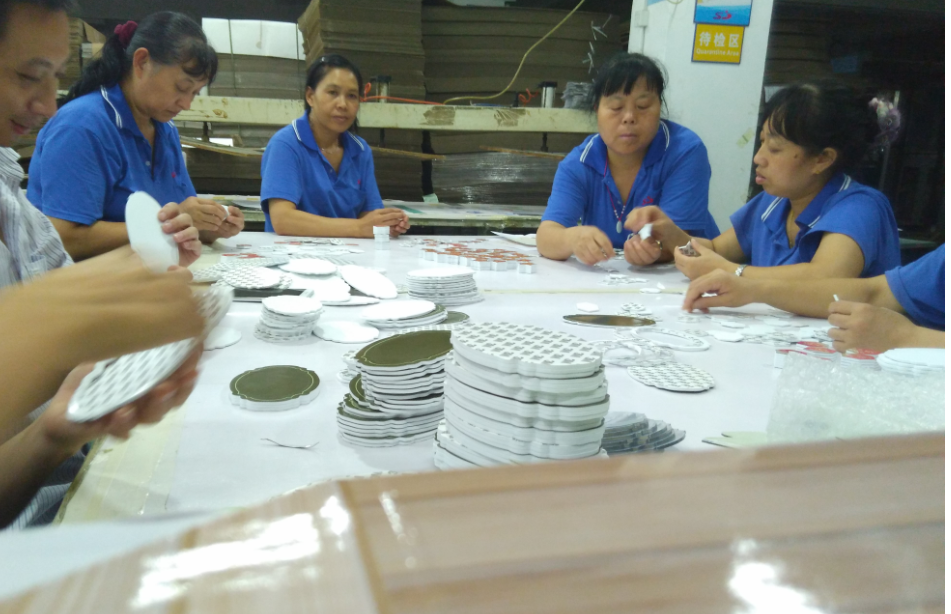 現在又遇到一個問題,化妝品眉筆展架的鏡子區域豎放不好看,可是鏡子已提前采購好,只能在材質上想辦法解決。原本用紙質的我們改成了用EVA,增加了很多手工,但展示效果更好了。